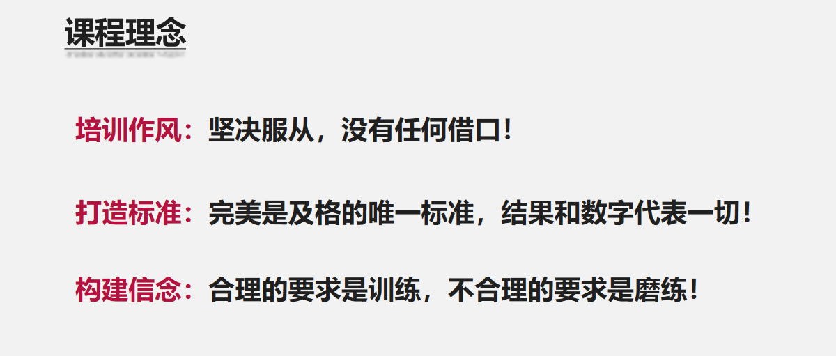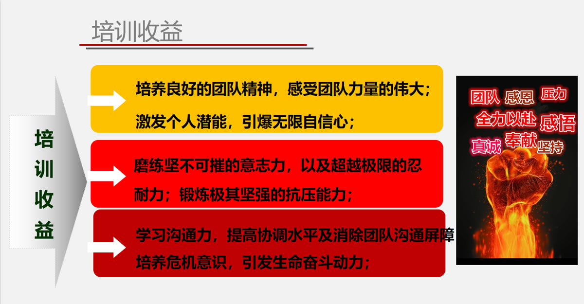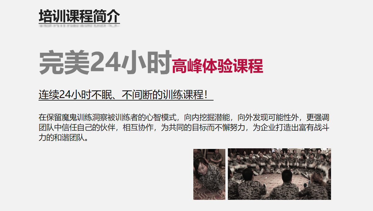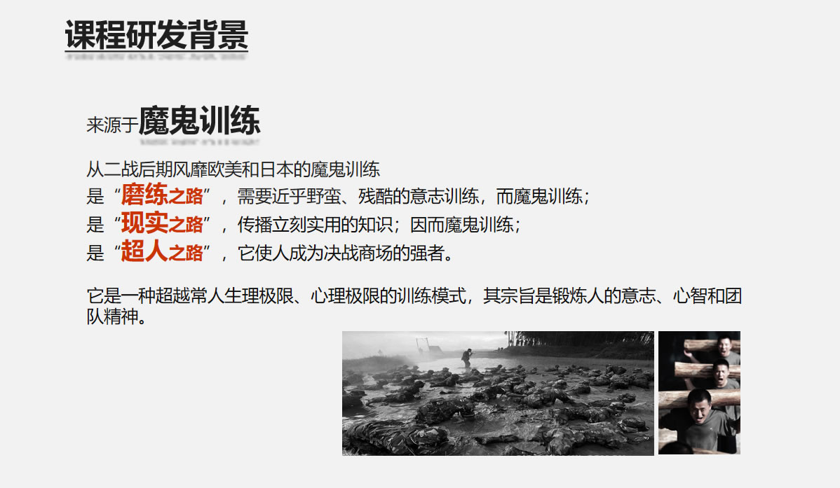 “速度”、“變化”、“創(chuàng)新”已經(jīng)成為這個時代的符號,“弱肉強食,快與慢吃”已經(jīng)成為企業(yè)在競爭道路上無法回避的殘酷現(xiàn)實。此課程引領(lǐng)大家感受軍營的嚴謹文化,體驗高強度的紀律、執(zhí)行與責(zé)任。通過對全體學(xué)員進行基礎(chǔ)的軍事化項目體驗,向部隊學(xué)習(xí),使學(xué)員完全放下平時工作生活中頭上的光環(huán),像軍人一樣嚴格要求自己,完全服從于團隊的目標(biāo)與利益,實現(xiàn)團隊價值,進而實現(xiàn)個人價值。