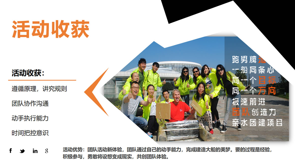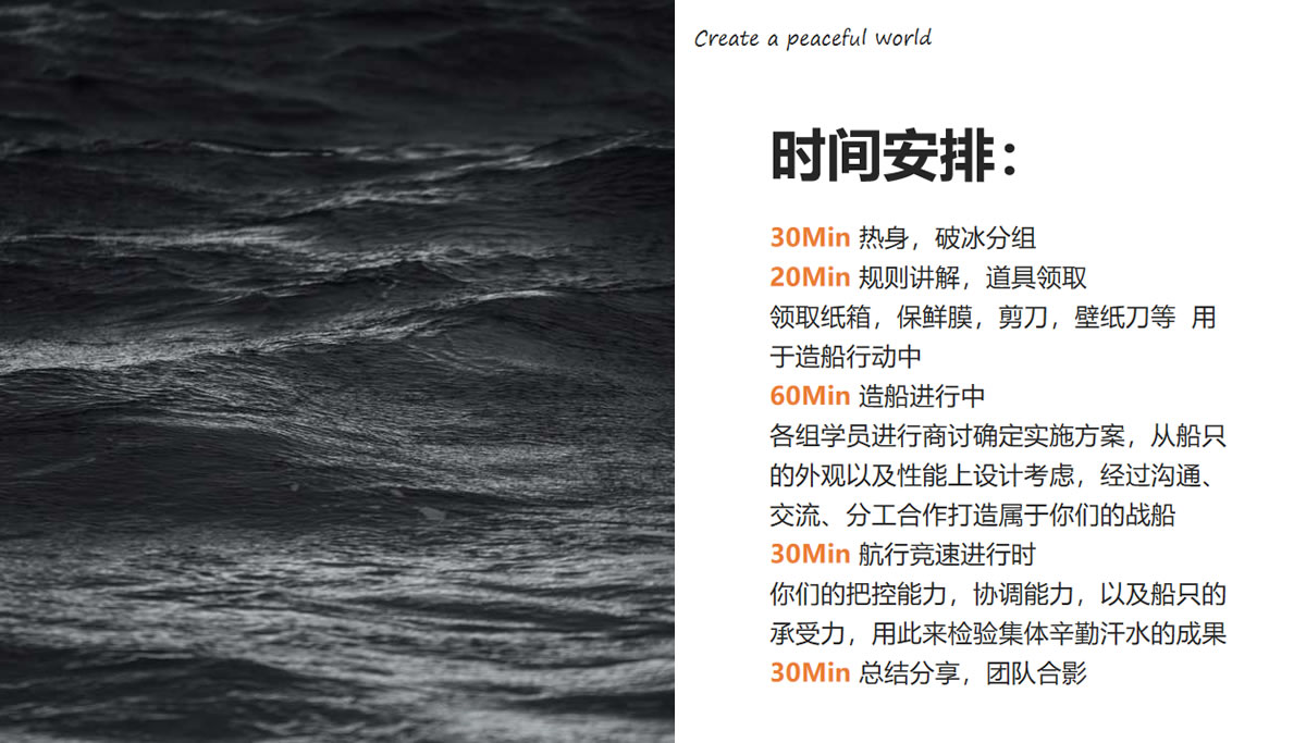 諾亞方舟課程體驗既具備常規(guī)拓展訓練的團隊合作,又帶有水上活動特有的娛樂性,在享受團隊喜悅的同時又能享受水上競速激烈爭奪?;顒右孕〗M為單位,各小組通過分析討論后,按照個人特性分工完成諾亞方舟制造,以抵達目的地的先后順序評定名次。活動僅提供必要的工具,其他所有的物料均需團隊人員自行獲取,且需就諾亞方舟的結(jié)構(gòu)達成一致的方案。