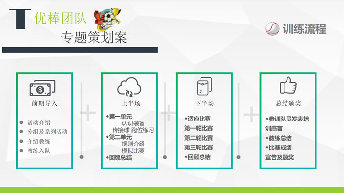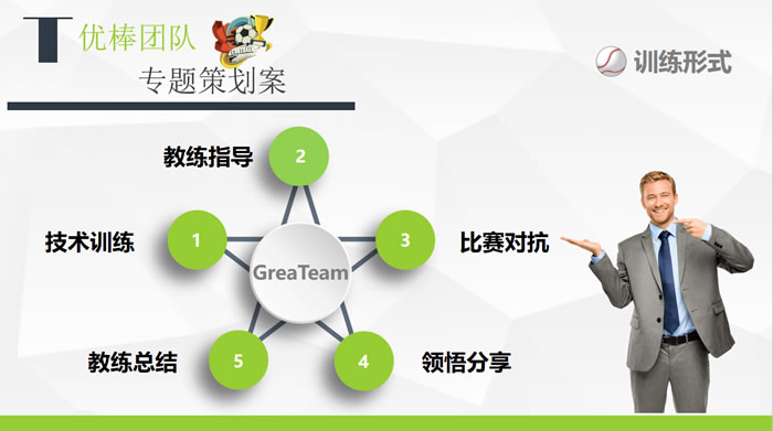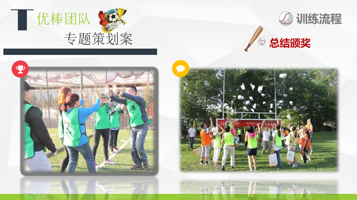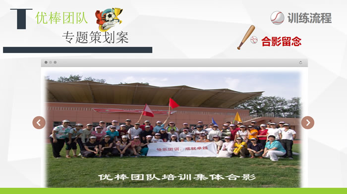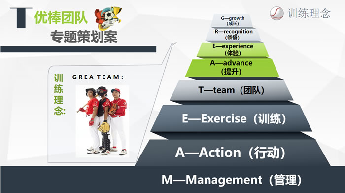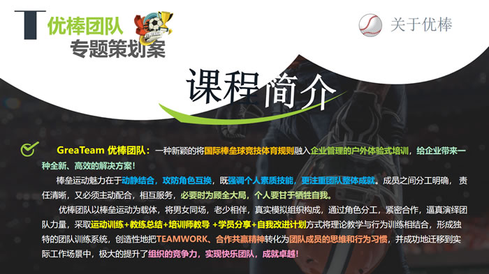 GreaTeam 優(yōu)棒團(tuán)隊(duì):一種新穎的將國際棒壘球競技體育規(guī)則融入企業(yè)管理的戶外體驗(yàn)式培訓(xùn),給企業(yè)帶來一種全新、高效的解決方案!優(yōu)棒團(tuán)隊(duì)以棒壘運(yùn)動(dòng)為載體,將男女同場,老少相伴,真實(shí)模擬組織構(gòu)成,通過角色分工,緊密合作,逼真演繹團(tuán)隊(duì)力量,采取運(yùn)動(dòng)訓(xùn)練+教練總結(jié)+培訓(xùn)師教導(dǎo) +學(xué)員分享+自我改進(jìn)計(jì)劃方式將理論教學(xué)與行為訓(xùn)練相結(jié)合,形成獨(dú)特的團(tuán)隊(duì)訓(xùn)練系統(tǒng),創(chuàng)造性地把TEAMWORK、合作共贏精神轉(zhuǎn)化為團(tuán)隊(duì)成員的思維和行為習(xí)慣,并成功地遷移到實(shí)際工作場景中,極大的提升了組織的競爭力,實(shí)現(xiàn)快樂團(tuán)隊(duì),成就卓越!