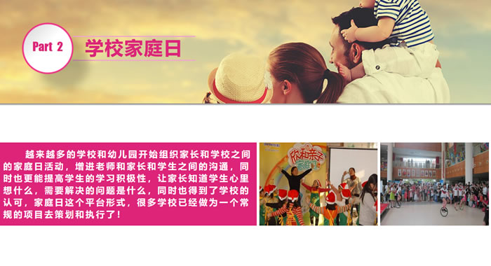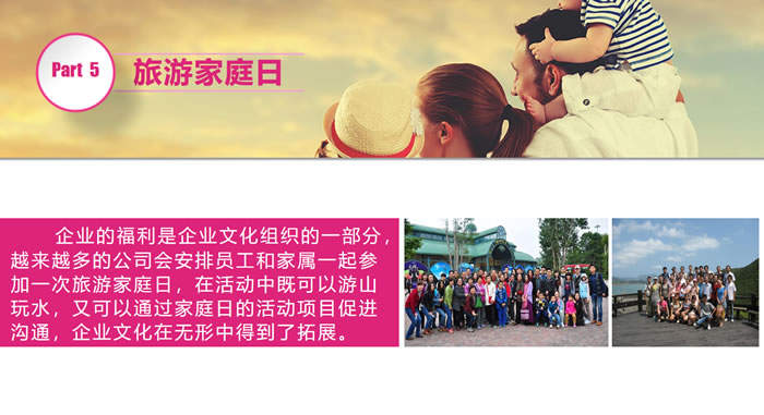 依家庭日是企業(yè)員工攜家屬共同參與的歡樂盛會,在輕松愉快的環(huán)境中,使員工和家屬充分體驗企業(yè)文化,增進員工之間的交流互動,和對企業(yè)的歸屬感和凝聚力。 豐富精彩的家庭日活動,將企業(yè)文化與家庭文化融合,激發(fā)員工及其家屬的自豪感,幫助員工贏得親人的鼓勵與支持,為企業(yè)創(chuàng)造更健康快樂的工作氛圍。