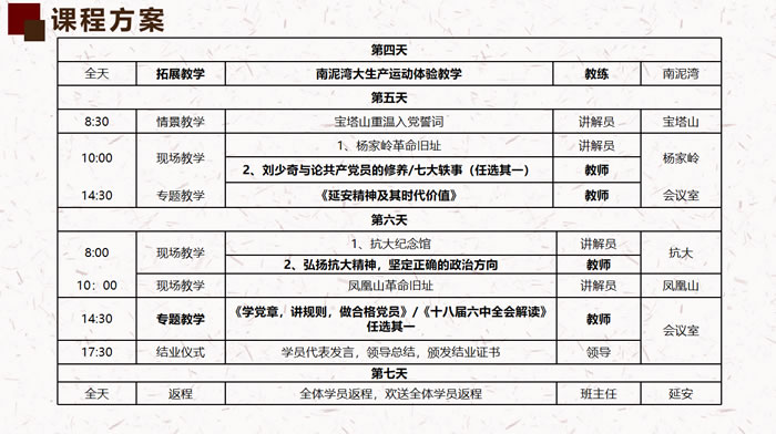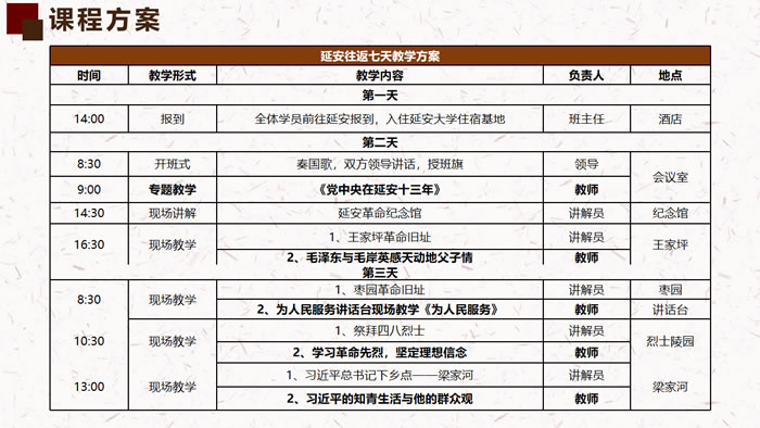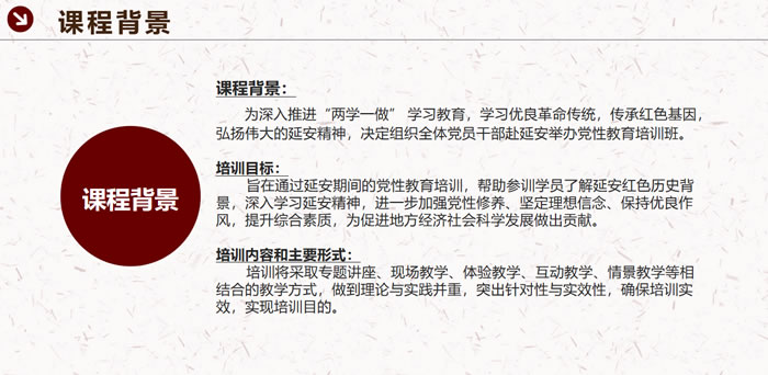 旨在通過延安期間的黨性教育培訓,幫助參訓學員了解延安紅色歷史背景,深入學習延安精神,進一步加強黨性修養(yǎng)、堅定理想信念、保持優(yōu)良作風,提升綜合素質,為促進地方經(jīng)濟社會科學發(fā)展做出貢獻。