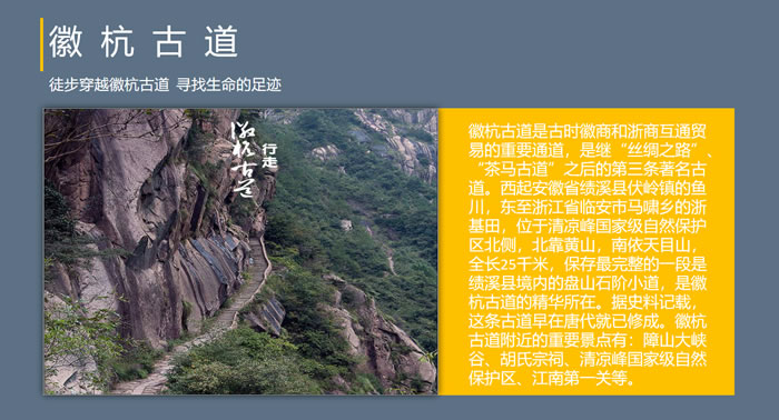 徽杭古道西起安徽省績溪縣漁川村,東至浙江省臨安市浙川村,全長五十余里,是古時聯(lián)系徽州與杭州的重要紐帶。保存最完整的一段古道是績溪縣境內的盤山青石板小道,長度大約5華里,這是徽杭古道的精華所在。走徽杭古道體會早期的商貿之路,增強新老員工的融洽度,提升員工自信心和挑戰(zhàn)能力!為什么要行走?行走的時候挑戰(zhàn)體能,感悟心靈。通過人最本能的行走,在過程中安靜下來,與自己對話,體會生命的熱度,聆聽心靈的聲音。較之人與人的交流,人與自然的交流更為恢弘,人與內心的交流更為深刻。所有人不只是為工作奔波忙碌,而是有機會走在自己心間的路上。