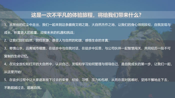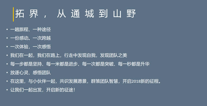 1、一次精彩的戶外之旅,這樣的旅程會有一個更好的溝通方式適合培養(yǎng)新老員工的融洽度;